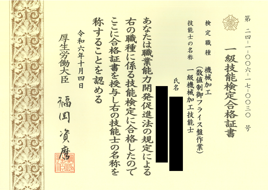 機械加工の数値制御フライス盤作業1級に3名合格しました!